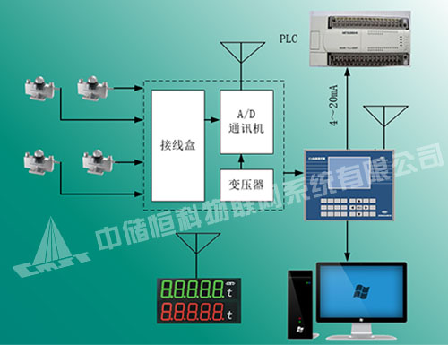 本方案與方案一的不同之處就是稱重顯示器在廢鋼車上,這樣做的好處就是數(shù)據(jù)處理速度快,系統(tǒng)簡(jiǎn)化。對(duì)傳感器的供電可以采用平臺(tái)車上的電源。