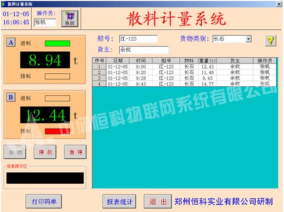 稱重控制儀表控制料斗A與料斗B交替進料和排料,并將重量數(shù)據(jù)實時傳輸至工業(yè)控制計算機,散料計量系統(tǒng)專用軟件自動記錄每次排料重量,從而實現(xiàn)對物料的連續(xù)計量。系統(tǒng)也可由多臺稱重控制儀表分別控制多個料斗,與一臺工業(yè)控制計算機構(gòu)成。