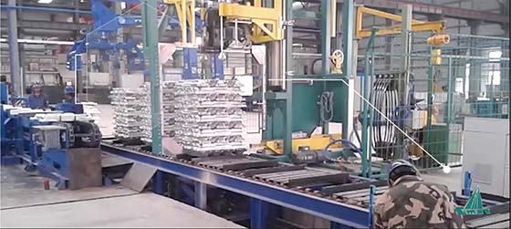 在成品輸送機(jī)第四垛位下方增加帶有升降結(jié)構(gòu)的稱重平臺(tái),實(shí)現(xiàn)鋁錠在線自動(dòng)計(jì)量。通過該系統(tǒng),可以提高車間工人的操作效率,避免重復(fù)勞動(dòng),提高鑄造車間的生產(chǎn)效率,具有很大的經(jīng)濟(jì)效益。
